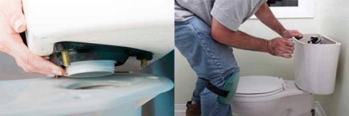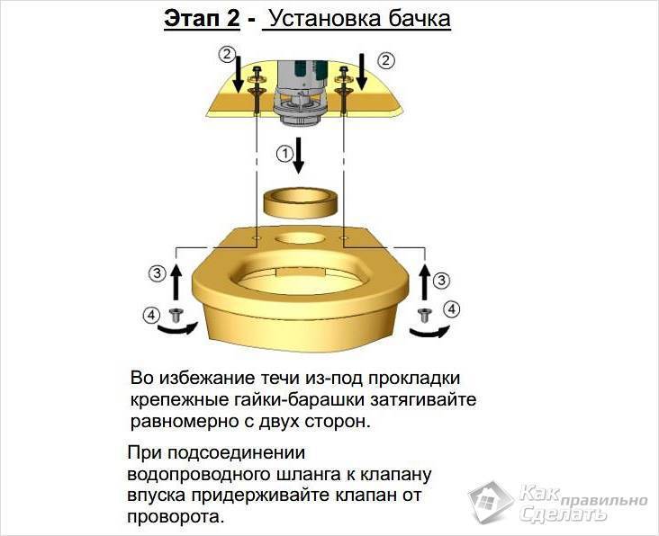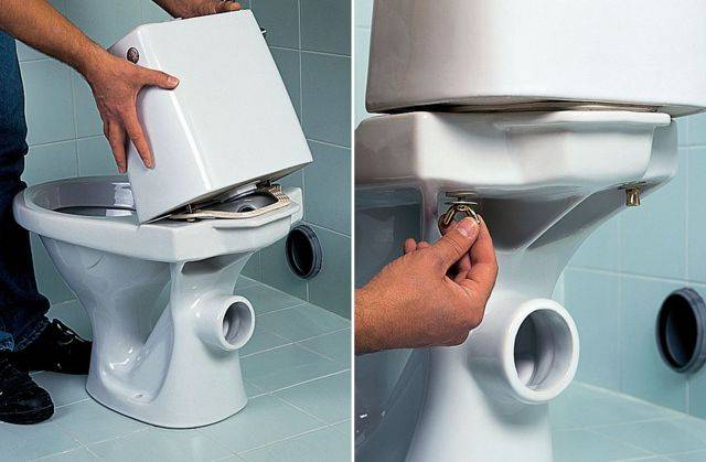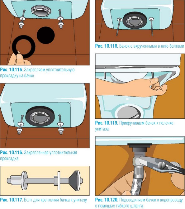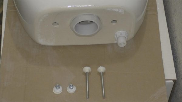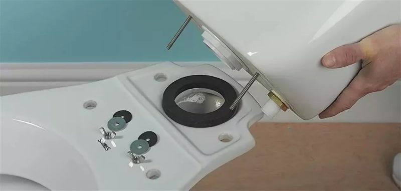 - l'étape suivante consiste à fixer le réservoir aux toilettes. Avant d'installer le réservoir, il est recommandé de remplacer la bague d'étanchéité. Le réservoir est fixé avec des boulons spéciaux;