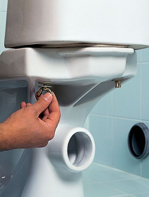 Le réservoir doit être déconnecté de la cuvette des toilettes. Il est fixé avec deux boulons, les écrous sont situés sur le dessous de la tablette arrière du bol. Pour les dévisser, vous aurez besoin d'une clé à molette ou d'une clé à fourche.Il est d'abord recommandé de poser un chiffon sur le sol ou de remplacer un récipient - l'eau restant au fond du réservoir se déversera certainement lorsque les attaches seront retirées.