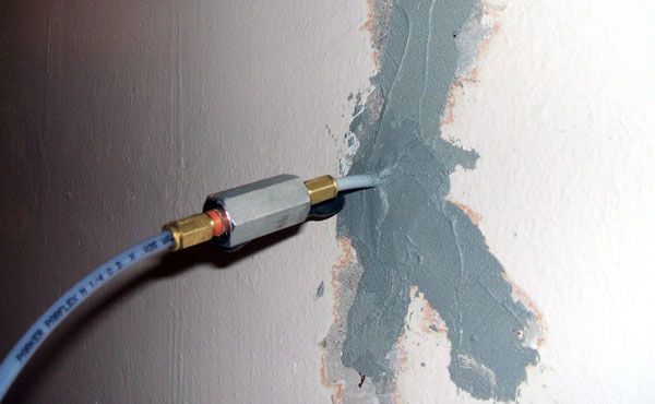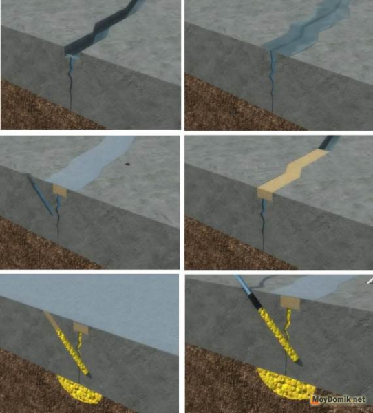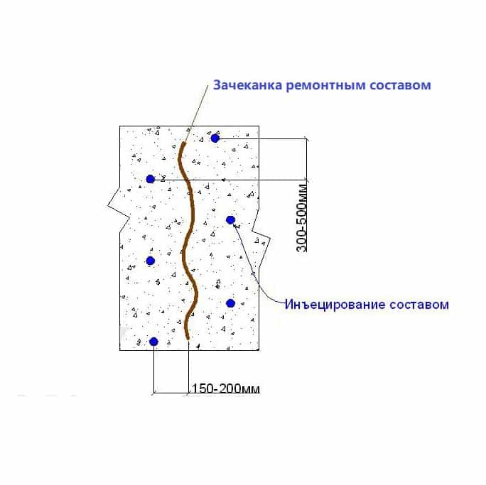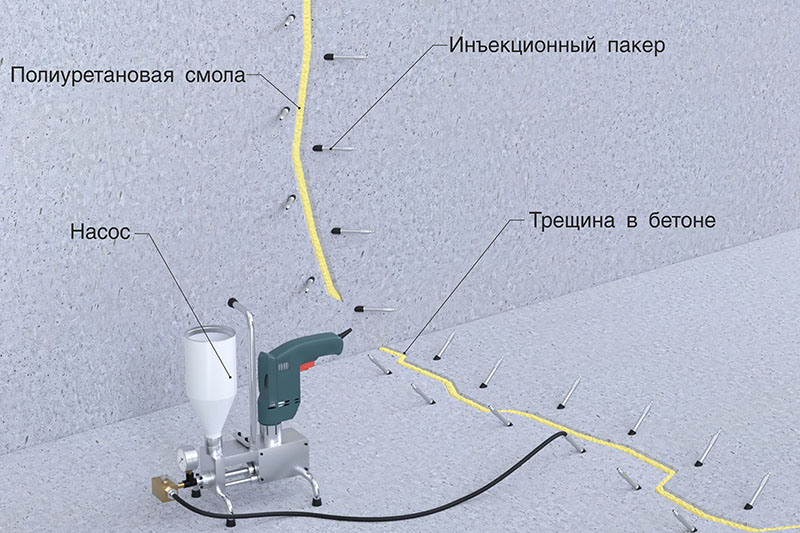 Le colmatage des fissures est réalisé principalement en remplissant la profondeur avec des mélanges synthétiques avec l'ajout de résines à faible viscosité. Des trous sont percés le long de la fissure, ils doivent être placés en diagonale, vers le défaut. Après cela, des bagues sont placées dans les trous et le mélange de travail est forcé à travers eux. La résine est ensuite pressée à l'aide d'un injecteur. Cette méthode permet d'assurer une bonne résistance de la structure et elle est capable de fonctionner dans son ensemble.