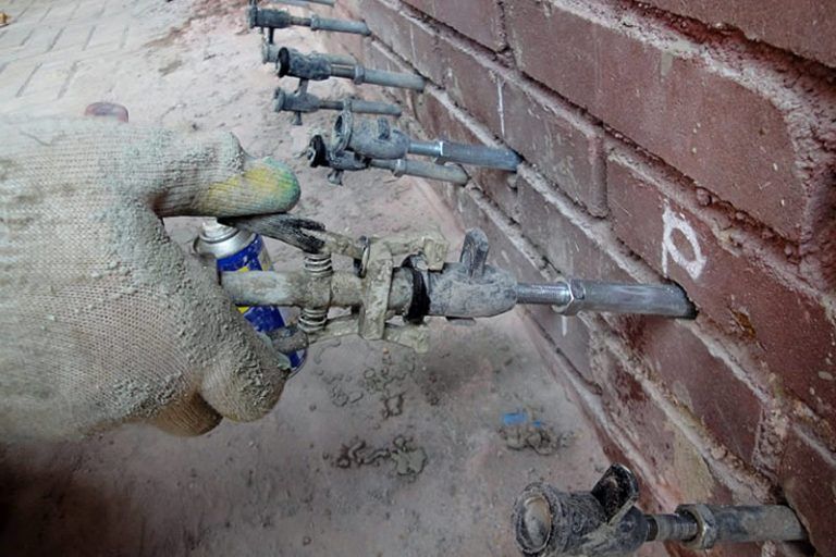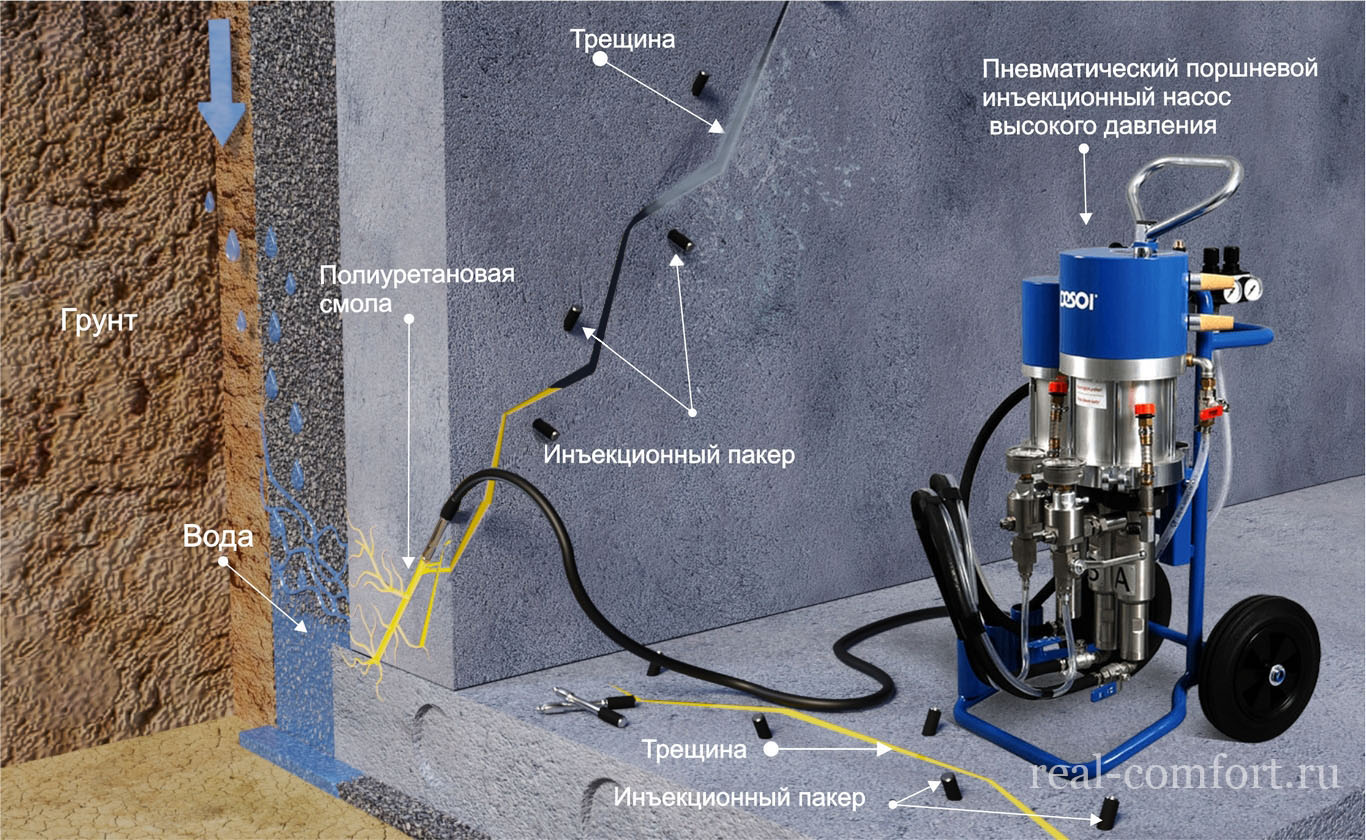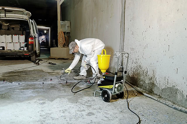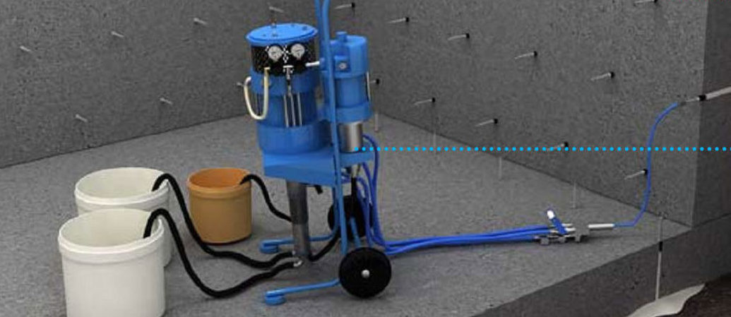 Les composés d'injection sont injectés dans le corps des structures de construction à l'aide de pompes spéciales via des dispositifs appelés packers. Il existe deux principaux types d'emballeurs - adhésifs et de forage. L'utilisation de l'un ou l'autre type de packers est déterminée par le type de composition d'injection, l'épaisseur de la structure, la profondeur et la largeur de l'ouverture de fracture.