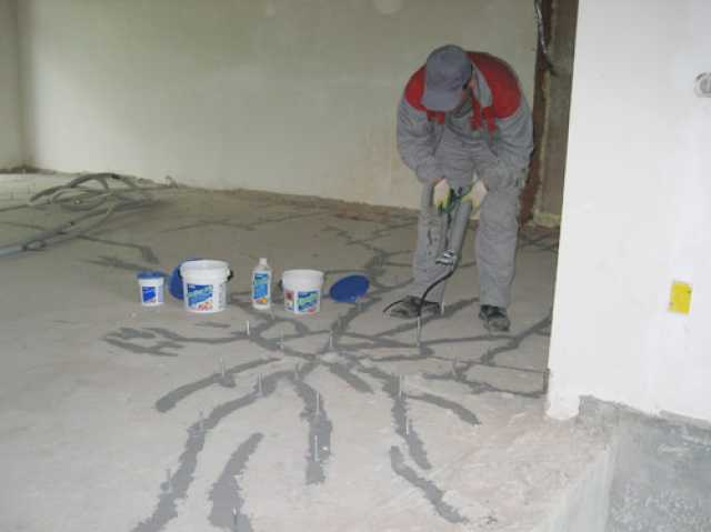 Si de petites fissures apparaissent dans la base monolithique, vous pouvez utiliser un composé de réparation à base de résine époxy. Le même outil convient à la réparation des fondations d'une maison privée. Les travaux se déroulent comme suit :
