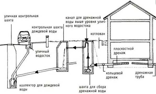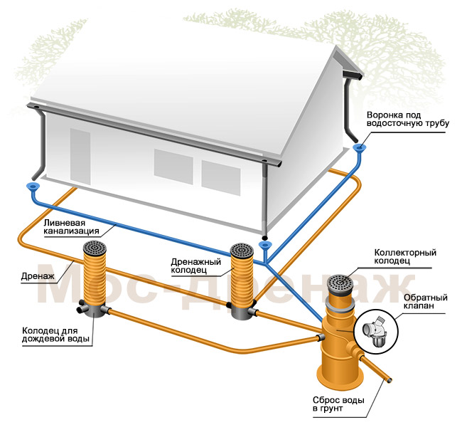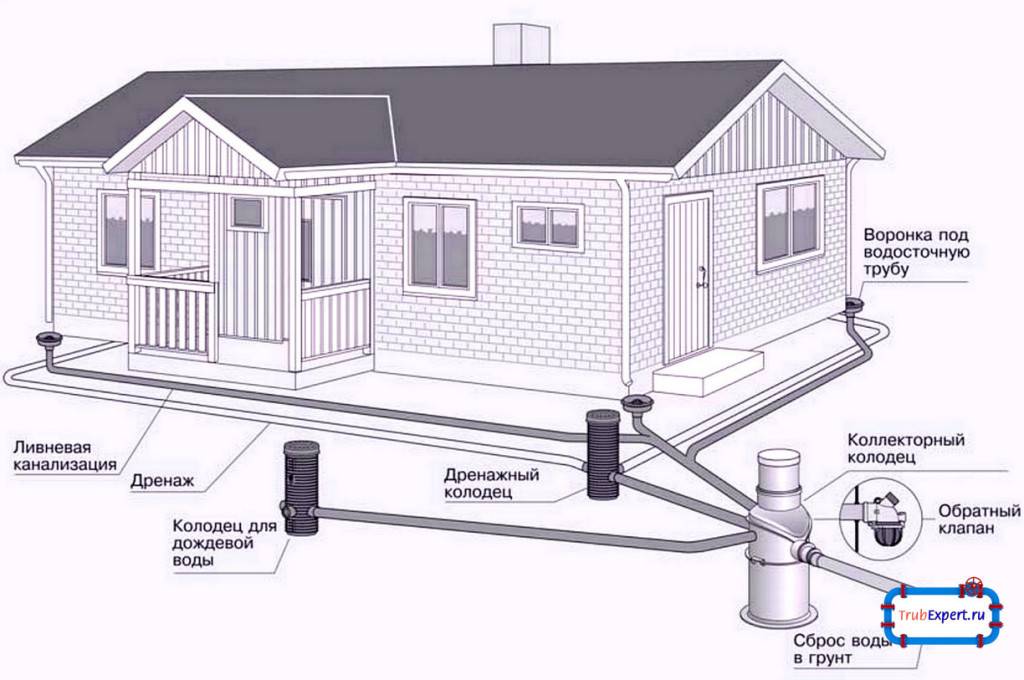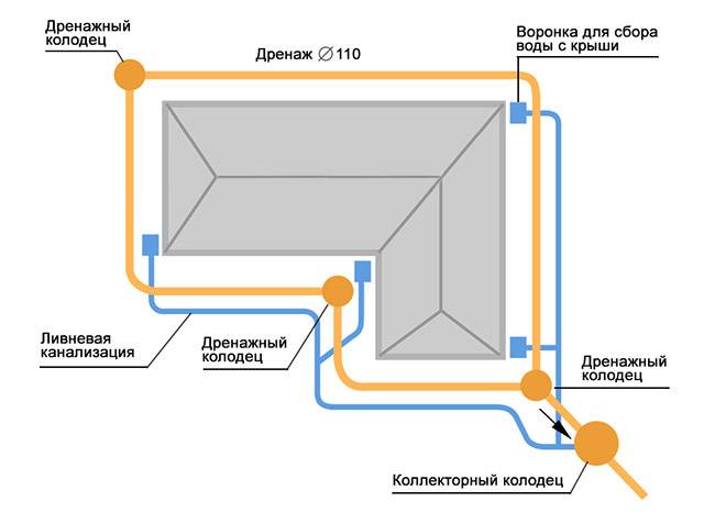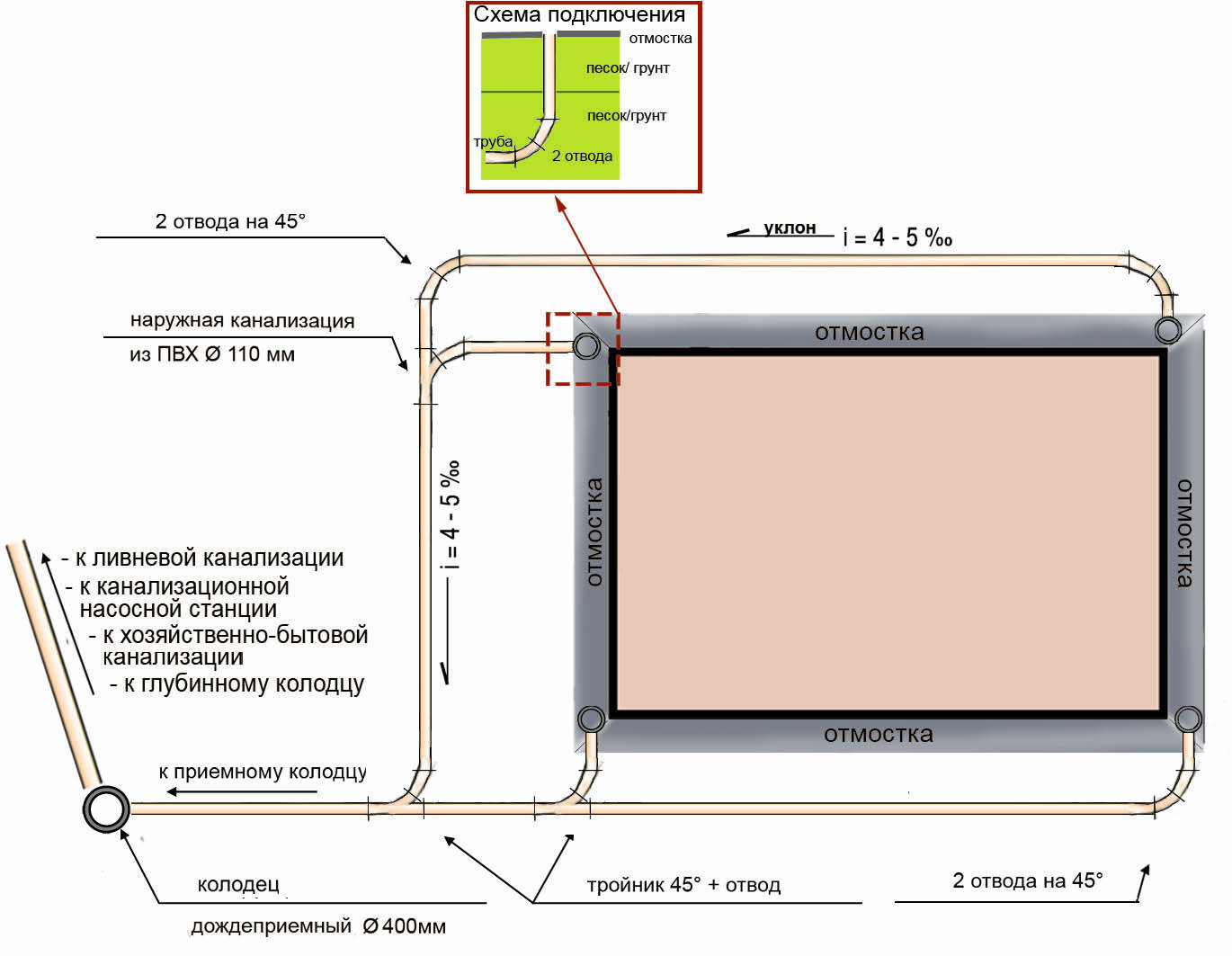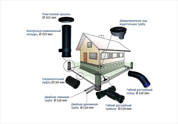 Pour ce faire, des tuyaux individuels sont combinés dans un système, dans la partie inférieure duquel un drain est disposé. Le système de drainage et d'égout pluvial sur le site peut être organisé comme suit :