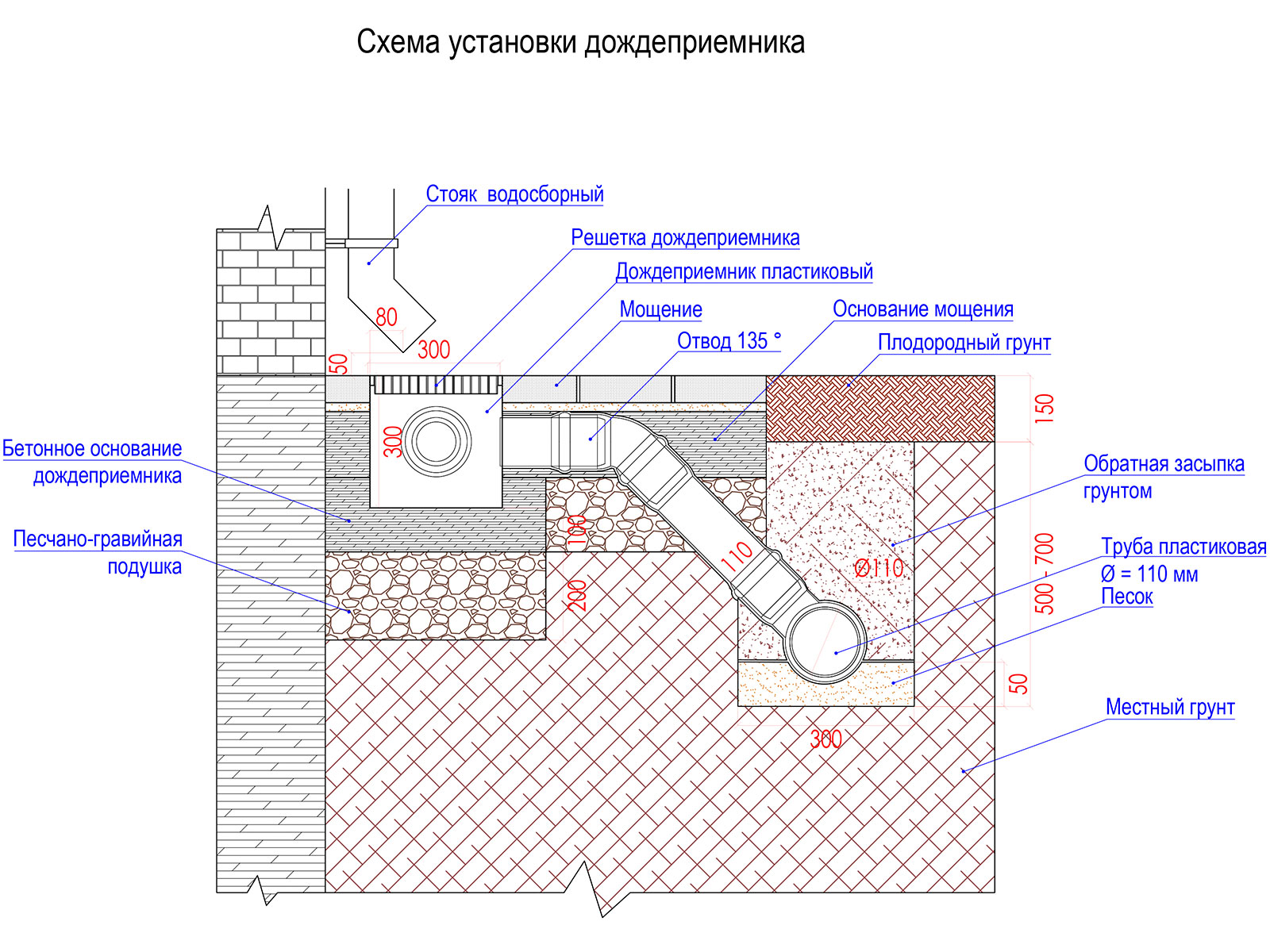 Ils sont placés sous les gouttières, aux points les plus bas du site. Les arrivées d'eaux pluviales peuvent être en plastique ou en béton. Le béton est utilisé pour les égouts pluviaux profonds. Ils sont mis un sur un, atteignant la hauteur requise. Bien qu'aujourd'hui, il existe déjà des entrées d'eaux pluviales en plastique intégrées.