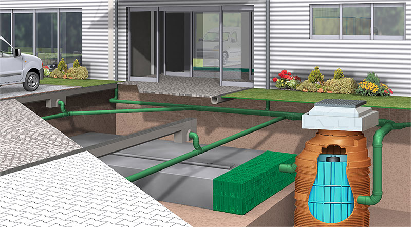 À travers les canaux de drainage, l'eau est déviée vers un puits collecteur, dans lequel elle est collectée et filtrée dans les couches de sol.