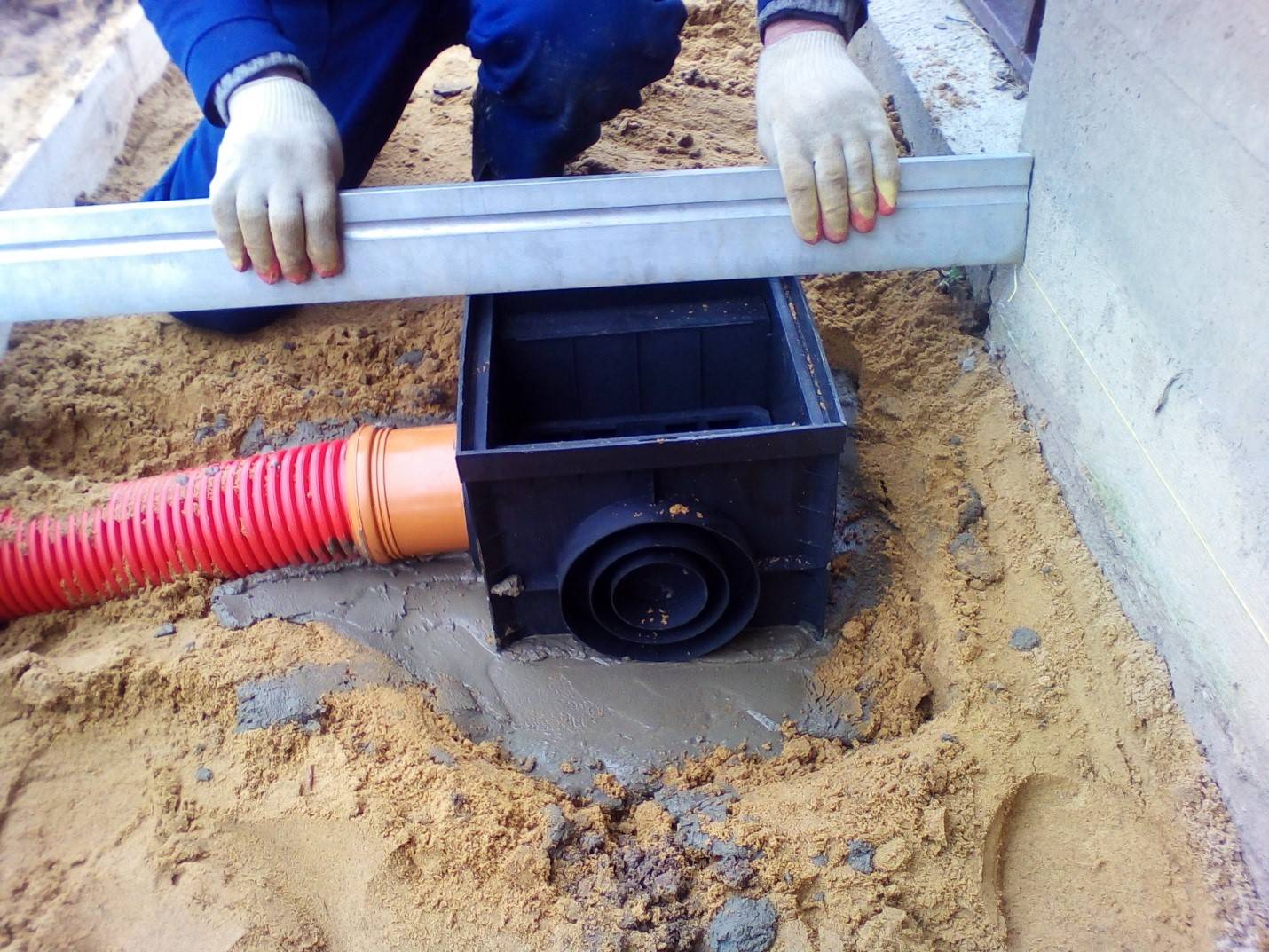 Entrées d'eaux pluviales linéaires ou canaux de drainage. Ce sont des gouttières en plastique ou en béton. Ces appareils sont installés dans les endroits où les précipitations sont les plus importantes - le long des surplombs du toit, si un système de drainage n'est pas réalisé, le long des trottoirs. Peut être installé sous les gouttières comme gouttières. Cette option est bonne si pendant la construction trottoirs autour de la maison aucune conduite d'eau n'a été installée. Dans ce cas, les récepteurs sont placés à l'extérieur de la zone aveugle, et la deuxième extrémité du plateau y est reliée. C'est une façon de faire un égout pluvial sans détruire la zone aveugle.