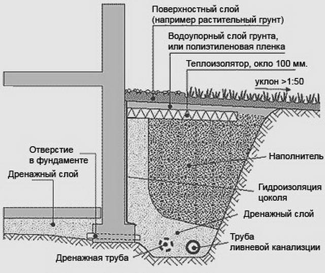 Systèmes de drainage muraux conçus pour pour l'enlèvement de terre l'eau de la fondation dans les zones fortement arrosées. La profondeur d'un tel dispositif doit dans tous les cas être supérieure à la profondeur de la fondation.