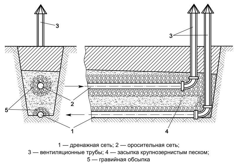 1. Dans le sens de la section la plus basse, la tranchée principale et ses "affluents" sont creusés en respectant la pente requise. La tranchée principale doit être un peu plus profonde que les autres.