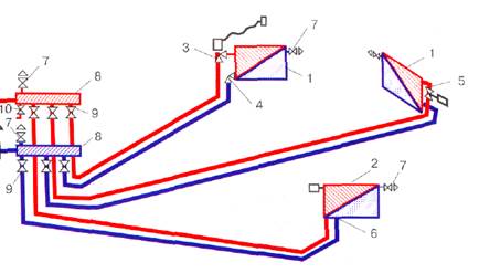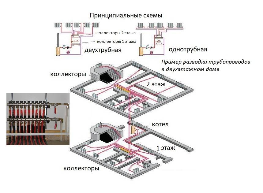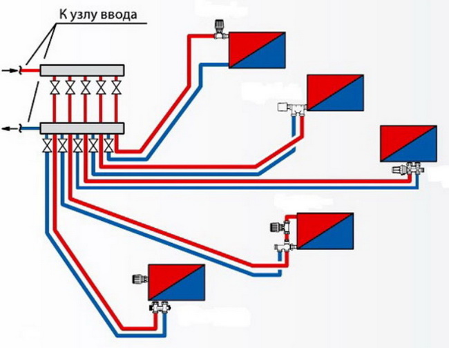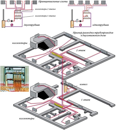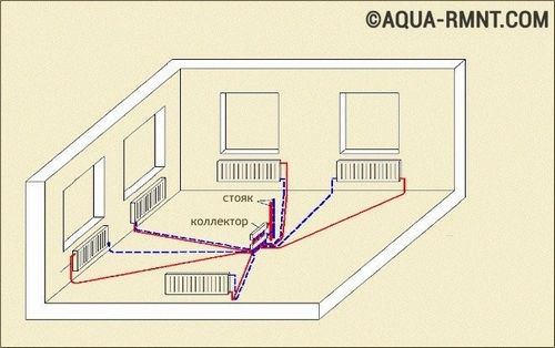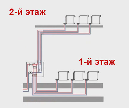 À chaque étage, près de la colonne montante du système à deux tuyaux, les collecteurs d'alimentation et de retour sont montés. Sous le sol, les tuyaux des deux collecteurs passent dans le mur ou sous le sol et se connectent à chaque radiateur du sol.