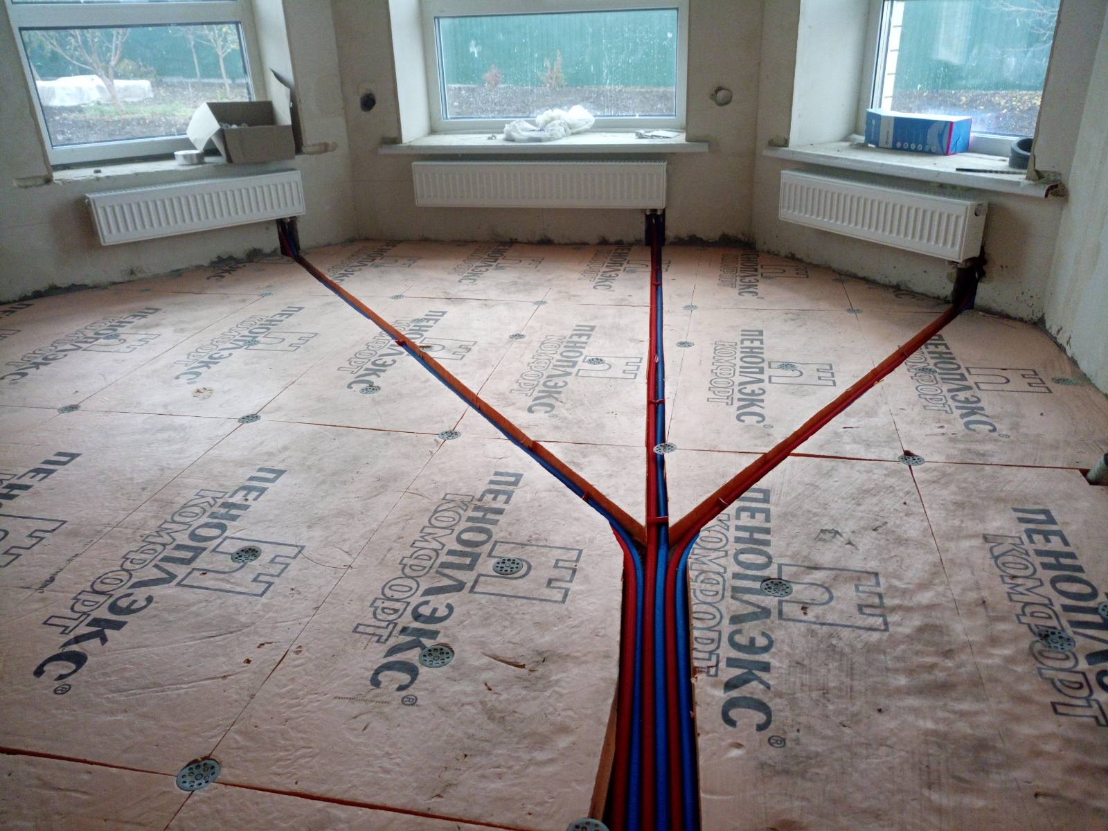 À comme sous-plancher peut être une dalle de fondation en béton. Une couche d'isolant est d'abord posée dessus, puis un pipeline est disposé. Si les tuyaux sont posés sans substrat calorifuge, l'eau de ces zones peut geler et perdre beaucoup de chaleur.