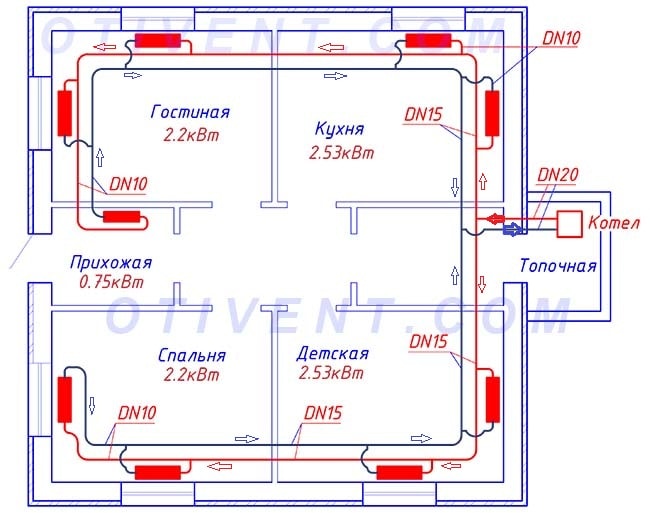 - Lorsque vous devez "accrocher" plus de six radiateurs sur une branche de câblage sans issue, augmentez le diamètre du tuyau d'une taille standard - au lieu de DN15 (20 x 2 mm), prenez DN20 (25 x 2,5 mm) et posez jusqu'à la cinquième batterie. Dirigez ensuite les lignes avec une section plus petite indiquée initialement (DN15).
