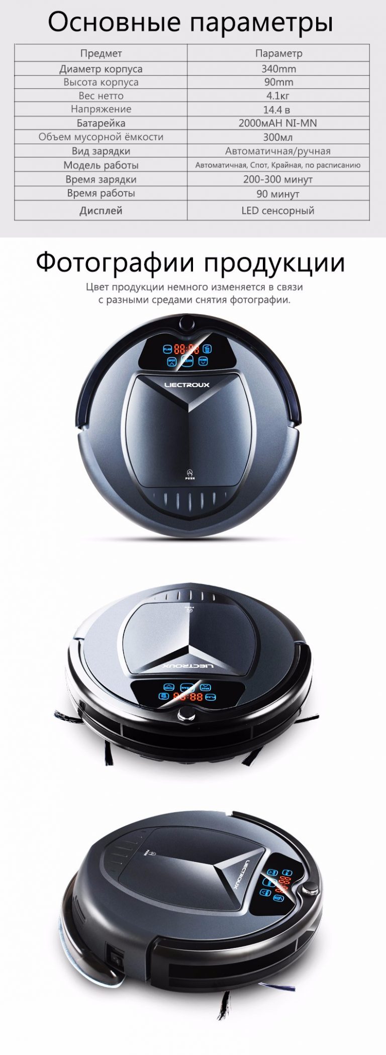 Dimensions des robots. La règle fonctionne ici - plus la hauteur est basse, meilleure est la perméabilité. Le diamètre du corps détermine la largeur de travail en un seul passage. Ce paramètre pour les robots Liectroux est de 32-35 cm, la taille de la brosse de travail est d'environ 15-18 cm.