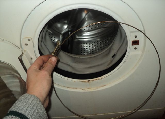 Donc, vous devez d'abord inspecter soigneusement le brassard et établir le pourcentage d'opportunité de sa réparation, ainsi que la cause et l'étendue des dommages. Pour ce faire, vous devrez retirer la pince à ressort qui maintient le brassard lui-même. Dans certains modèles de structures de lavage, il sera nécessaire de retirer complètement le capot avant et, dans certains cas, même de retirer le tambour.