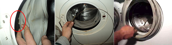 Si une fuite est visible sous la trappe de chargement ou le corps, le brassard est d'abord inspecté. Si la partie extérieure supérieure est endommagée, de l'eau peut s'écouler directement sous la porte. Un dysfonctionnement plus complexe est un dommage à l'intérieur. Ensuite, une fuite se produit sous le corps de la machine à laver automatique (CMA).