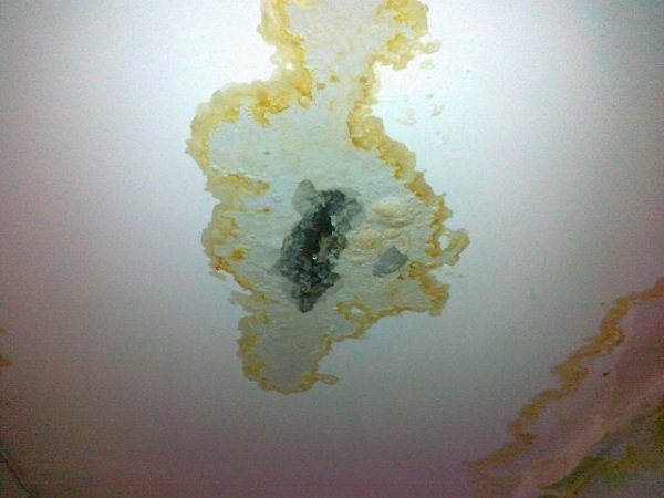 Ce type se trouve le plus souvent dans les appartements et les maisons.La réparation du plafond après une inondation doit le plus souvent être effectuée par les résidents des étages supérieurs, les maisons privées avec un toit peu fiable et ceux qui sont inondés par les voisins. Laissez la pièce sécher complètement avant de réparer. Par conséquent, vous devrez endurer la présence de taches et de taches sur les murs pendant un certain temps. Pour accélérer le séchage de la pièce, vous pouvez également la réchauffer ou sécher les gouttes avec un sèche-cheveux de bâtiment. Mais vous devez d'abord enlever le mastic exfolié et la peinture. Il n'est plus récupérable.