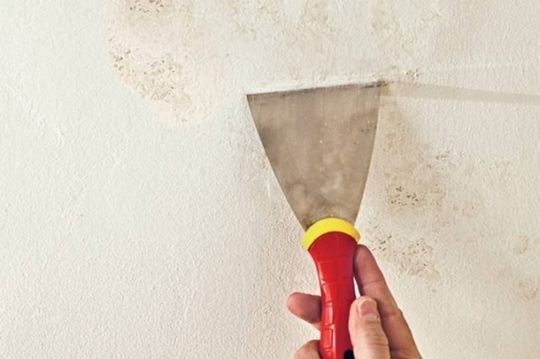 La première méthode qui peut être utilisée est l'élimination mécanique des taches. Cette option ne nécessite pas l'utilisation de produits chimiques et est totalement sûre. Vous devrez nettoyer la peinture, le mastic, enlever le plâtre humide avec une spatule. Toutes les surfaces endommagées doivent être soigneusement nettoyées.