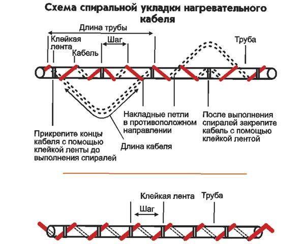 Cette méthode d'installation nécessite une attention et une précision particulières, sinon le câble chauffant tombera en panne en raison de virages serrés et répétés. Le fil peut être posé près du tuyau ou avec un affaissement. Dans le premier cas, l'élément chauffant est soigneusement déroulé du raccord et enroulé sur la canalisation à un certain intervalle. Dans la deuxième version, le câble est posé en spirale de sorte que sa partie inférieure s'affaisse et n'adhère pas au produit.