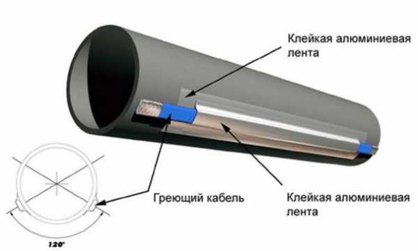 Sur les conduites d'eau qui longent la rue, il est préférable de poser le câble en forme de spirale, ce qui permet un chauffage plus efficace. Il en va de même pour les tuyaux de grand diamètre, lorsque l'installation en spirale devient plus rentable que la pose de 3-4 lignes droites. La technologie de fixation reste inchangée - le collage de la feuille et la fixation avec des colliers sont effectués sur tous les types de tuyaux - plastique et métal.