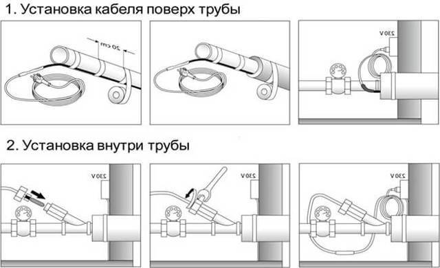 Les câbles thermiques de chauffage de l'eau sont montés de deux manières - à l'extérieur et à l'intérieur du tuyau, chacun d'eux a ses avantages et ses inconvénients. Les avantages de la première option sont les suivants :