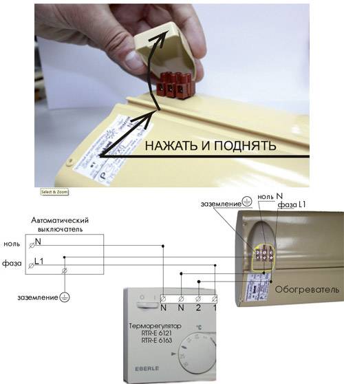 Vous devez d'abord connecter les contacts de la prise électrique pliable aux borniers du thermostat, qui sont installés dans le boîtier du produit. Chaque "prise" a sa propre désignation: N - zéro, L - phase. Il convient de noter qu'il y a au moins deux bornes zéro et phase chacune (du réseau au régulateur et du régulateur au réchauffeur). Tout est assez simple - vous dénudez les fils, les insérez dans les sièges jusqu'à ce qu'ils cliquent (ou serrez les vis). Assurez-vous de suivre le code couleur des fils afin que la connexion soit correcte.
