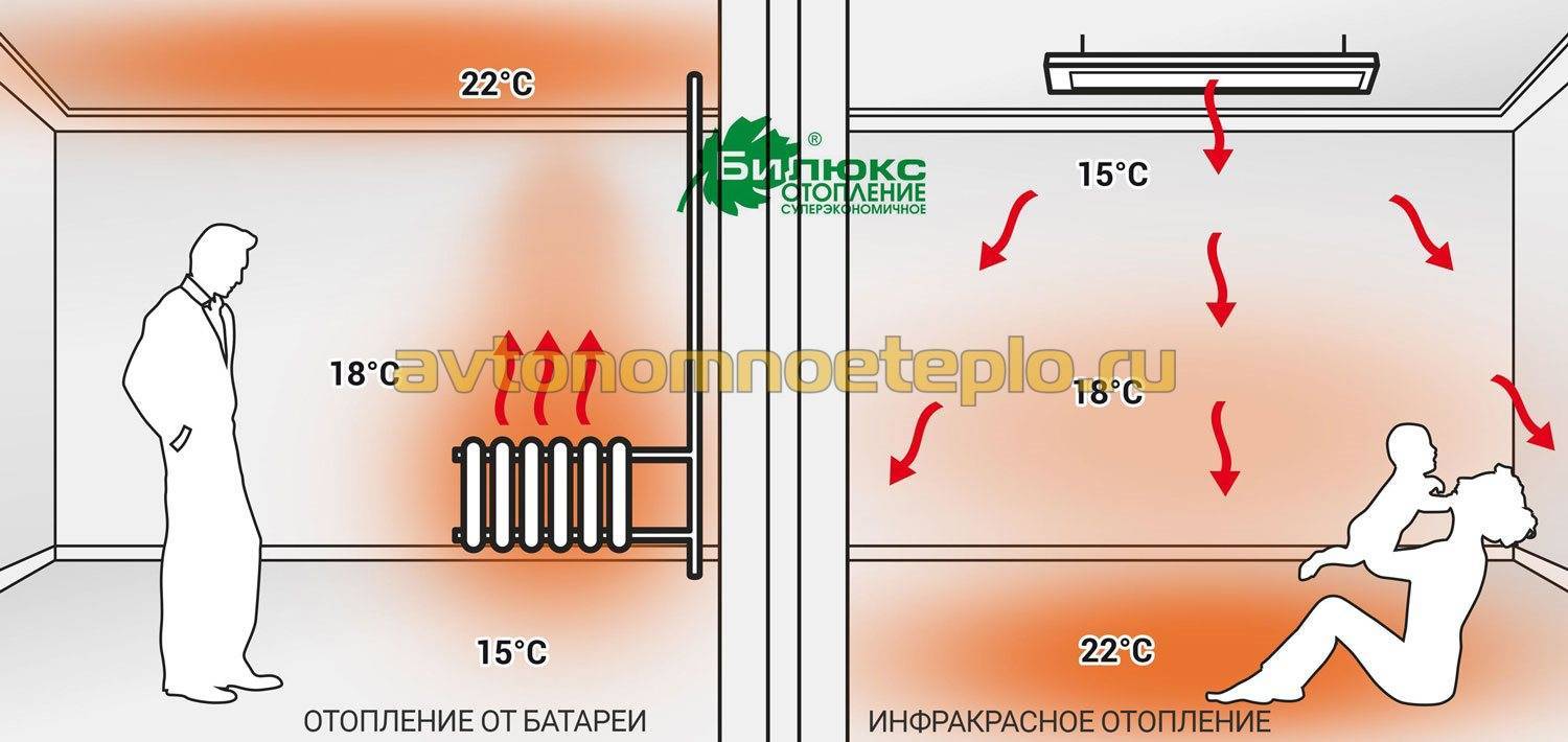- Petite consommation d'énergie. Premièrement, il n'y a pas de pertes d'énergie pour le chauffage de l'air. Deuxièmement, le rayonnement infrarouge réduit la température globale de l'espace de 3 à 5 ºС, ce qui permet d'économiser jusqu'à 25% d'énergie. C'est-à-dire que la température de l'air est ressentie en moyenne 5 degrés de plus que celle indiquée par le thermomètre lors de la mesure. Et tout cela parce que non seulement l'air mesuré est chauffé, mais aussi les objets dans la pièce et même la personne elle-même.