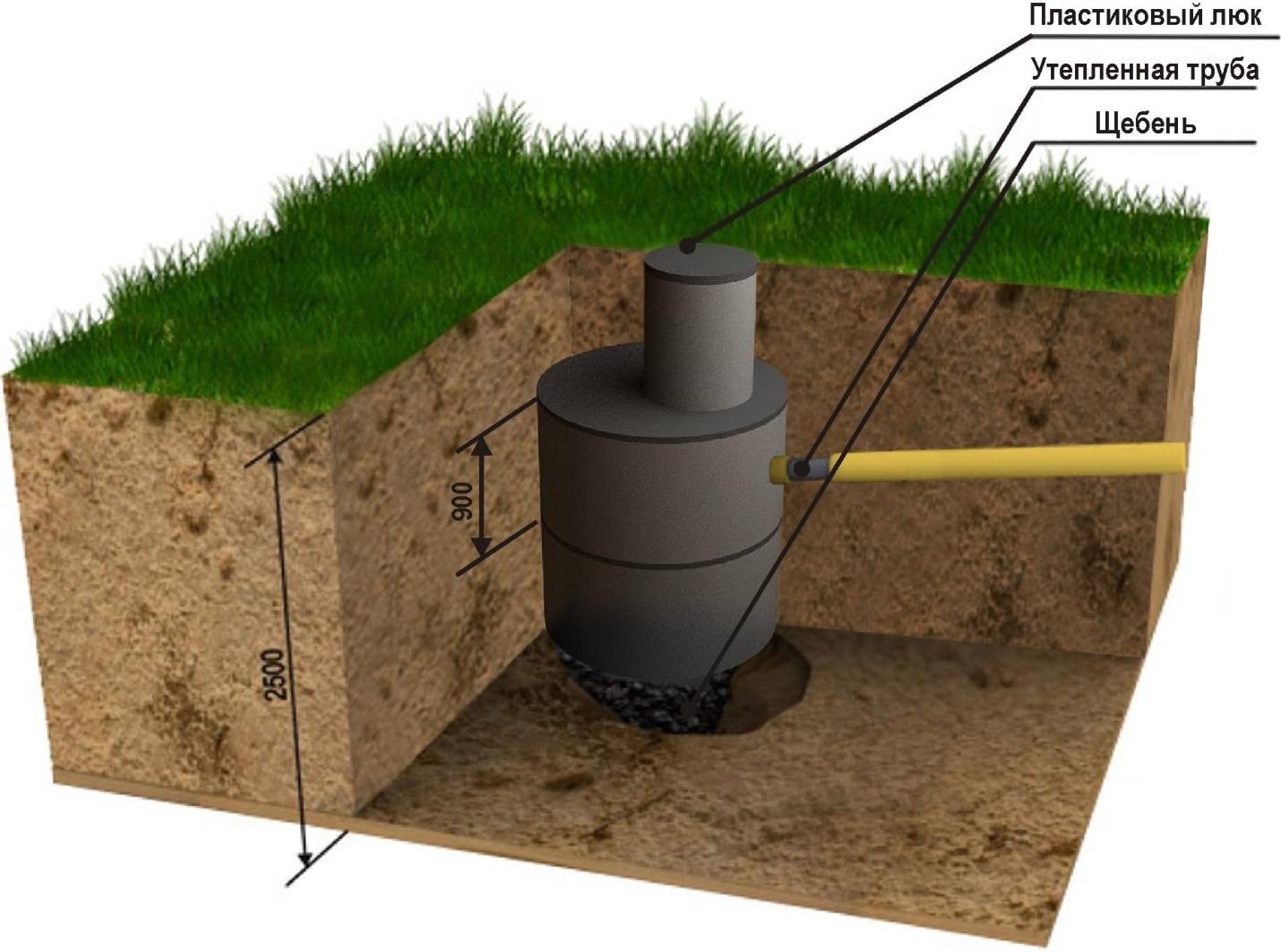 La partie principale de stockage du réservoir est enterrée d'environ 1 m, car le tuyau d'égout d'entrée doit être en dessous du niveau de congélation du sol. Le volume du conteneur est sélectionné en tenant compte du nombre de vidanges quotidiennes.