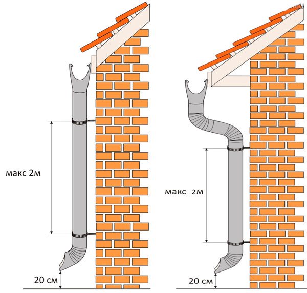 • Le nombre de tuyaux de drainage sera égal au nombre d'entonnoirs. Mais ici, le côté esthétique doit également être pris en compte. En règle générale, l'installation de tuyaux de descente est effectuée aux coins de la maison. Ainsi ce sera plus beau. Mais si le mur est trop long, des tuyaux supplémentaires doivent être installés.