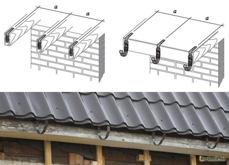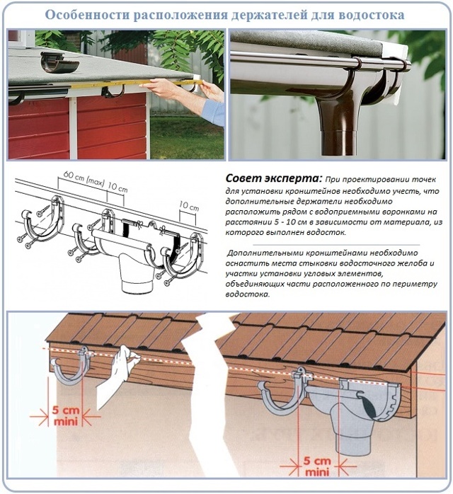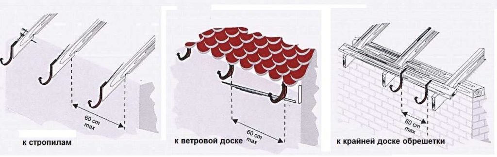 4. Fixation à la caisse - avec un pas de chevron supérieur à 60 cm, la gouttière est fixée avec de longs supports si le toit est en tuiles métalliques ou en onduline. Ou utilisez des équerres combinées dans le cas de tuiles en bitume.