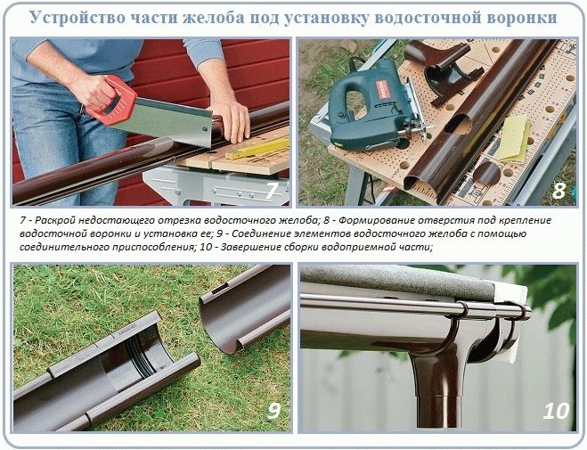 Cette étape commence par l'installation des entonnoirs de sortie. Il est nécessaire de faire un trou à l'emplacement de l'entonnoir, pour cela une scie à métaux avec une petite dent est utile. Assurez-vous de nettoyer les bords de la coupe, puis appliquez deux bandes de colle en maintenant une distance de 5 cm entre elles.Ensuite, vous devez mettre un entonnoir sous la gouttière et, reliant ces deux éléments ensemble, chauffer le plastique des deux côtés . Il existe un autre moyen de fixer les éléments de la structure en plastique - à travers la gomme d'étanchéité. Chacune de ces options a ses propres avantages et inconvénients. Ainsi, lors de l'utilisation du soudage à froid, la fixation s'avérera plus fiable, mais la dilatation thermique du matériau peut jouer une blague cruelle. Et dans le second cas, les dilatations linéaires ne sont pas terribles, mais le caoutchouc perd ses propriétés avec le temps.