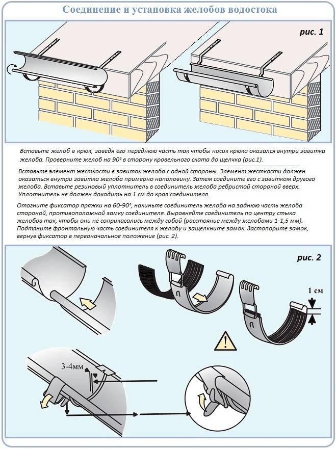 De plus, la gouttière elle-même est montée sur les crochets déjà fixés. Cela se fait comme suit: sous la partie pliée du support, le bord avant de la gouttière est inséré et tourné à 90 °, il se mettra donc en place. Pour fixer ce composant, des plaques spéciales sont utilisées.Les joints d'angle sont réalisés à l'aide d'éléments spéciaux, tandis que les extrémités ouvertes sont fermées par des bouchons.