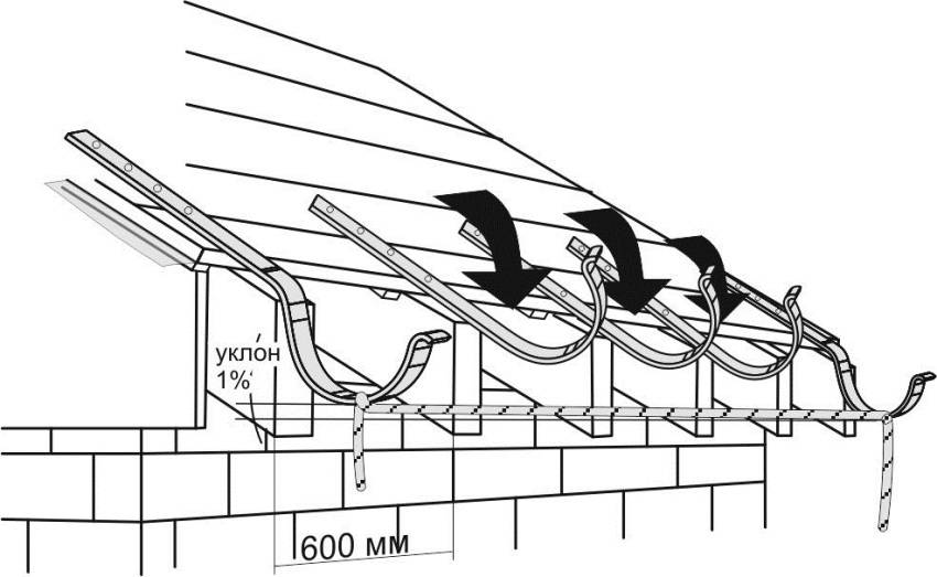 Après l'achat, vous pouvez procéder directement aux travaux d'installation. Tout d'abord, les supports sont fixés à une distance d'un demi-mètre les uns des autres (pour une gouttière en plastique), pour les produits métalliques, ce paramètre peut atteindre un mètre et demi. Ils sont fixés dans la partie frontale du toit, et s'il n'y en a pas, les pieds du chevron s'adapteront. Tout d'abord, les éléments extrêmes sont installés, après quoi la ficelle est tirée entre eux et, en se concentrant dessus, intermédiaire