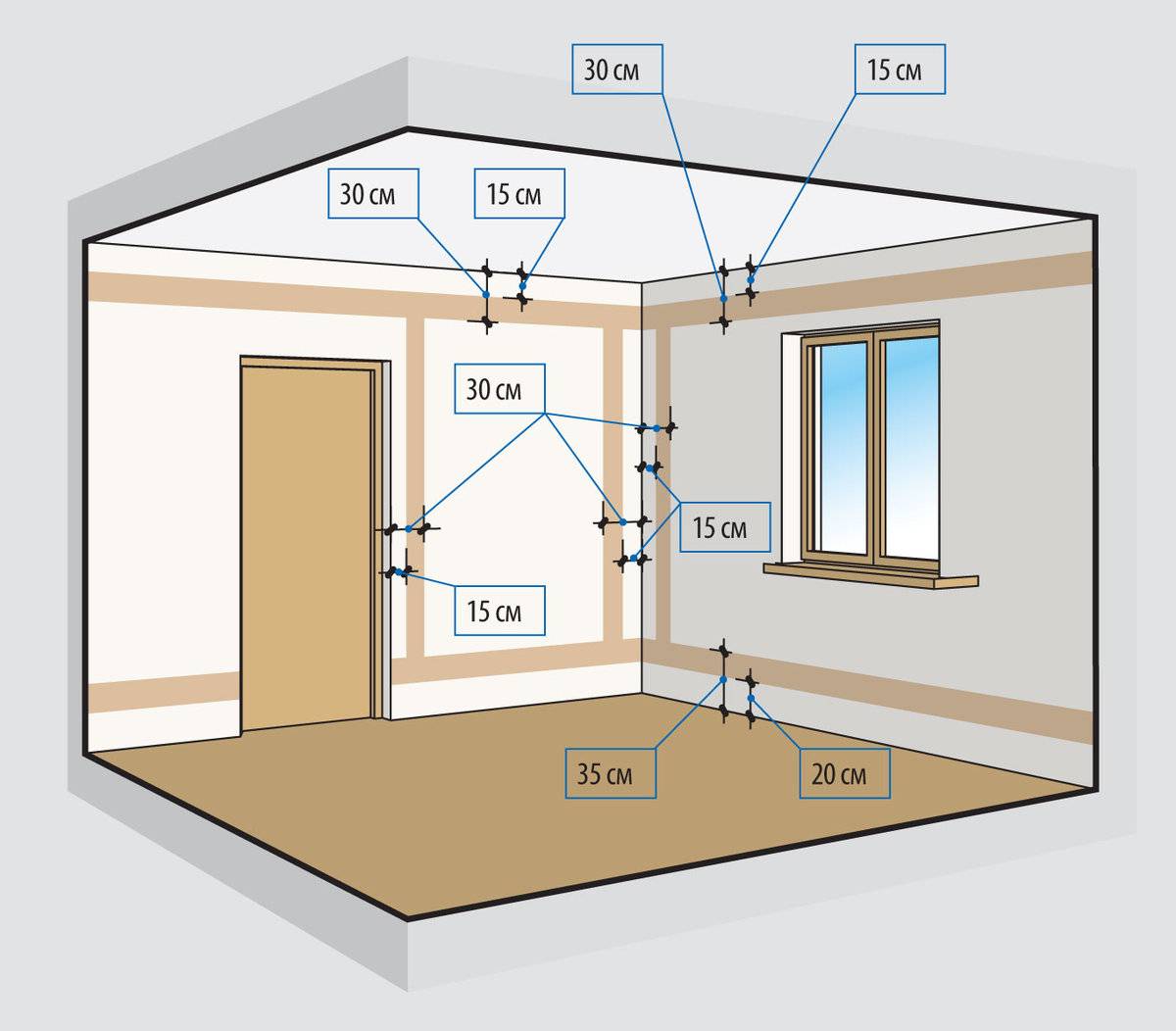 Une boîte ou un socle sera optimal comme structure de support et de protection. Ils peuvent être posés le long des murs de manière assez esthétique, mais lorsque l'éclairage est connecté, le joint de plafond peut ne pas être très beau. Dans ce cas, il est possible de combiner deux types de câblage: posé ouvertement le long des murs et caché derrière le plafond.