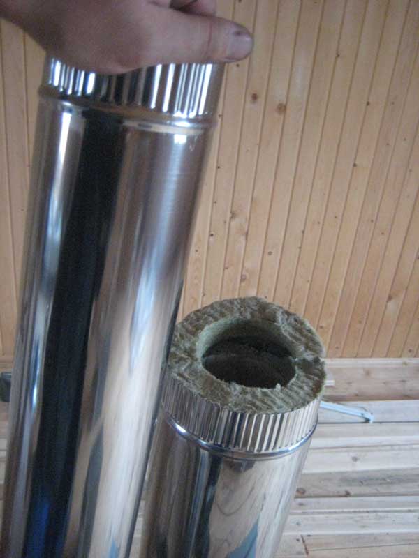 Pour une cheminée d'un poêle de sauna, l'option préférée est les deux tuyaux en acier inoxydable, mais l'enveloppe extérieure ne doit pas nécessairement être en acier inoxydable. Le principal est la chambre à air. L'épaisseur de paroi des sandwichs en acier inoxydable peut aller de 0,5 à 1,0 mm. Pour un poêle de sauna, ils conviennent soit avec une épaisseur de 1 mm (celui-ci est en acier inoxydable qui est aimanté) ou de 0,8 mm (c'est-à-dire s'il n'est pas aimanté). Nous ne prenons pas de parois de 0,5 mm dans le bain - ce sont des sandwichs pour les chaudières à gaz. Dans les bains, ils brûlent très rapidement.