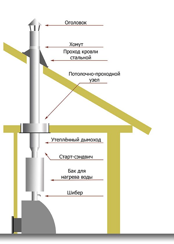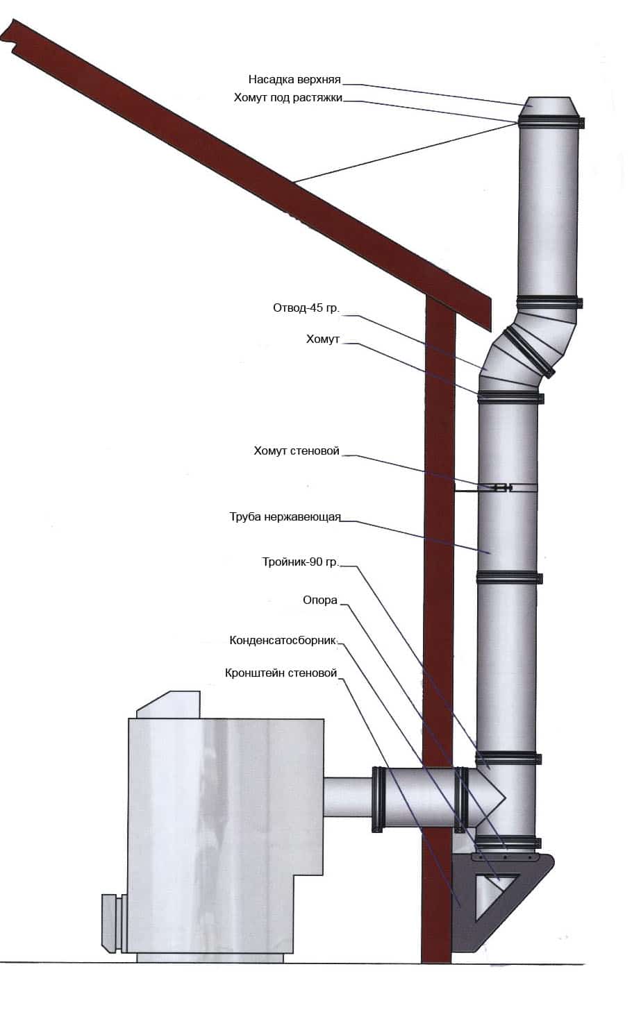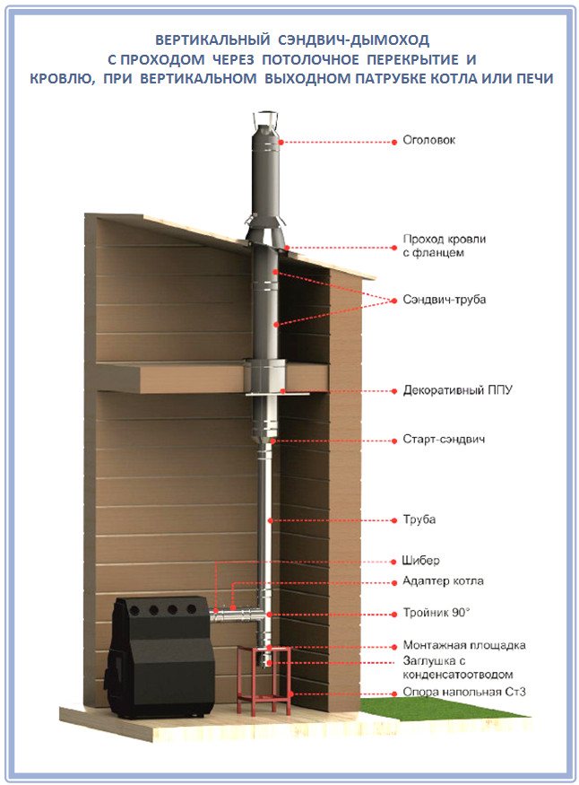 Le diamètre du tuyau pour les cheminées peut être sélectionné en fonction de sortie chaudière. La règle est simple : la section du sandwich ne doit pas être inférieure à celle de ce tuyau. Plus est autorisé. Quant à la hauteur, vous pouvez obtenir un résultat garanti si vous prenez sa valeur à au moins 6 m. De plus, la hauteur est mesurée de la grille d'une chaudière à combustible solide jusqu'au sommet du tuyau.