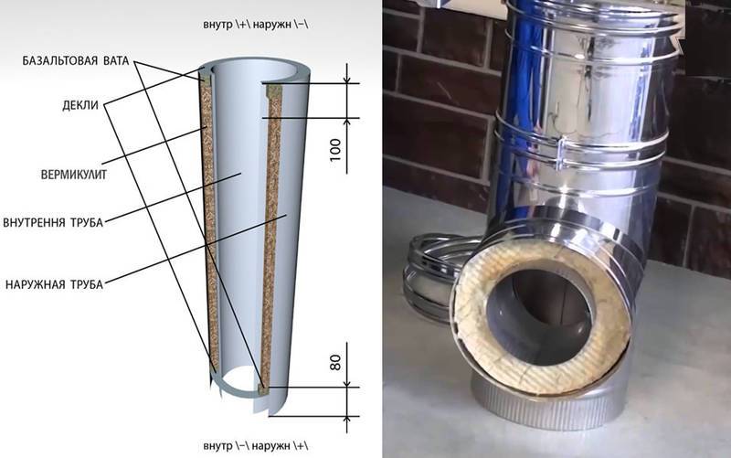 De par leur conception, les "sandwichs" sont constitués de deux tuyaux de diamètres différents, en tôle d'acier inoxydable fortement allié. La connexion entre eux est réalisée par soudage à l'argon. L'espace formé entre les deux tuyaux est rempli d'un matériau spécial d'isolation thermique, souvent à base de basalte, d'une largeur de 25 à 60 millimètres.