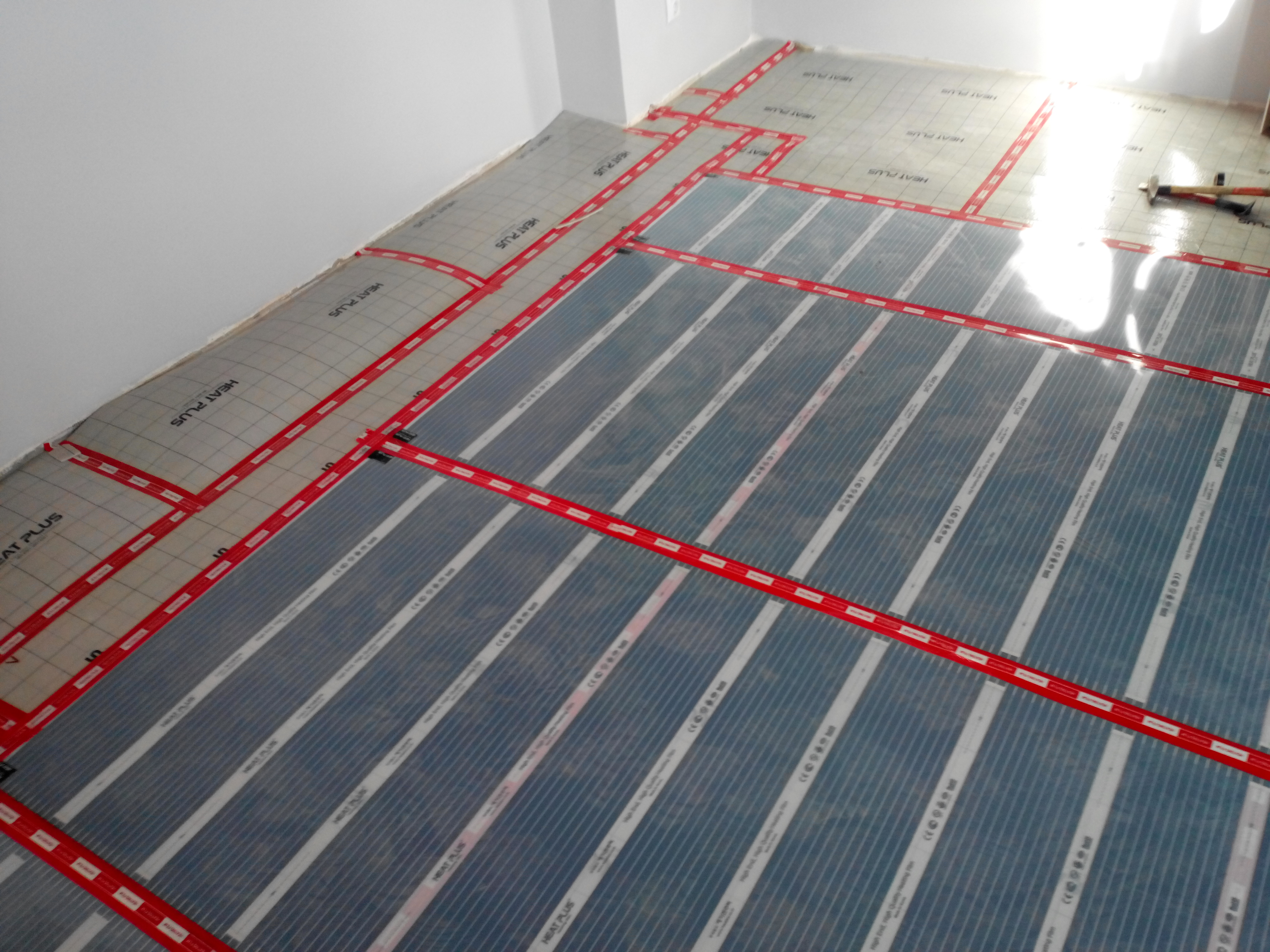 Selon les instructions, le film de chauffage au sol sous le stratifié ne doit pas couvrir toute la surface. Les zones où seront placés les meubles lourds sont laissées libres