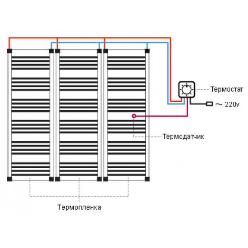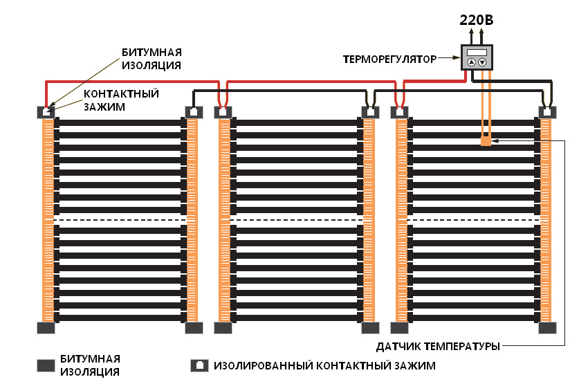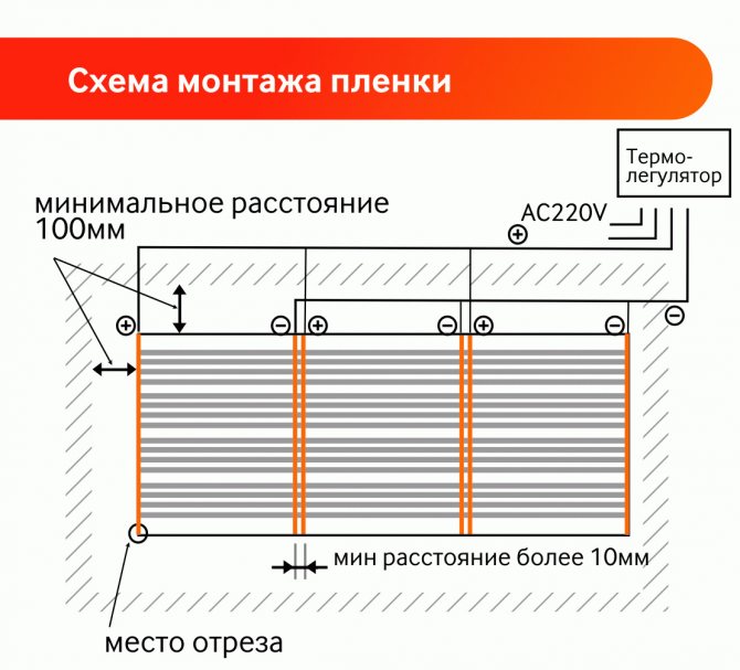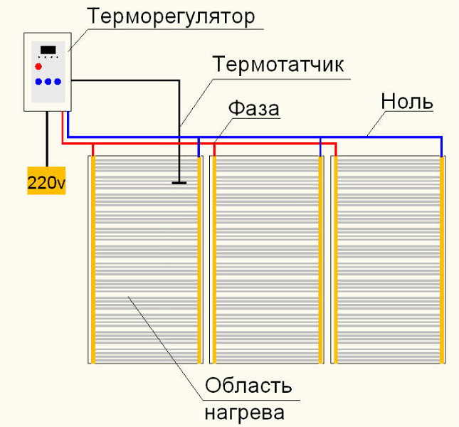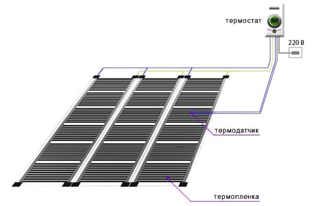 Le premier chemin de chaque morceau de film, les fils d'alimentation (phase et zéro) sont amenés à la prise ou à la boîte de jonction, où les fils sont connectés en parallèle les uns aux autres.Après cela, leurs conclusions sont connectées au thermostat.