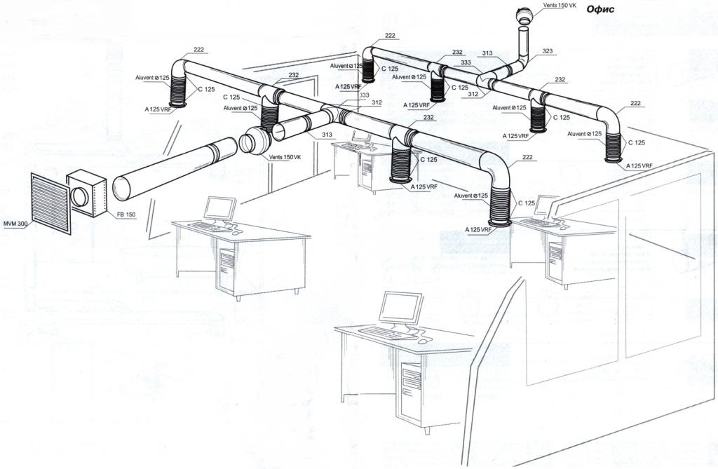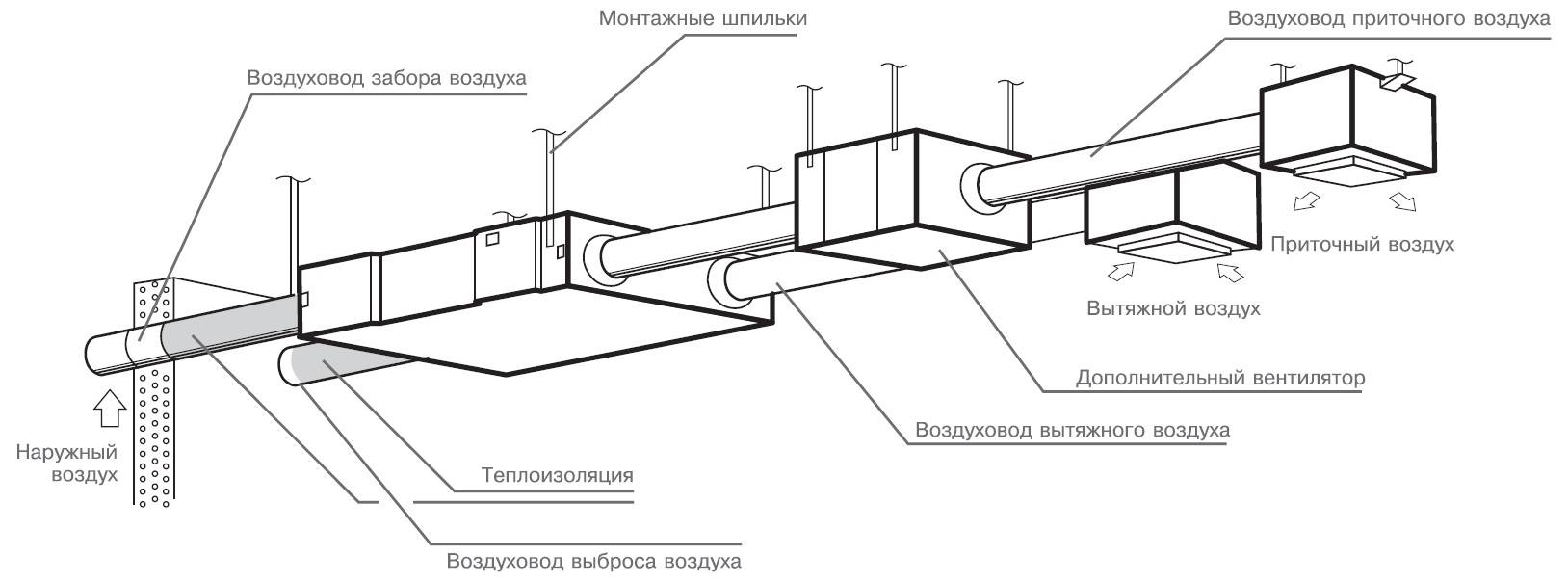 Le mouvement des flux d'air à l'intérieur du bâtiment et à l'extérieur s'effectue par des conduits de ventilation verticaux et horizontaux. L'installation des tuyaux de ventilation est effectuée conformément aux marques de conception indiquées dans les dessins d'exécution. Les règles d'installation sont données dans les recueils réglementaires SP 73.13330.2016 et SP 60.13330.2016.