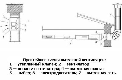 Schéma de principe pour l'installation dans les maisons de campagne et à la campagne - ventilation avec circulation d'air naturelle. Il convient aux bâtiments en brique et en bois, ainsi qu'aux structures en béton d'argile expansée. En règle générale, la conception d'un tel schéma prévaut dans la construction d'immeubles à appartements. Si vous avez acheté un appartement à Khrouchtchev, laissez-vous guider par le fait qu'il y aura une ventilation naturelle.