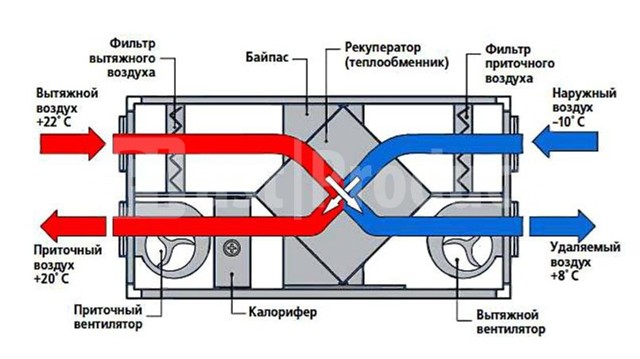 Le complexe de ventilation dans le cas d'un circuit mixte est un système de canalisations dont certaines aspirent l'air extérieur, d'autres évacuent l'air vicié à l'extérieur du bâtiment. L'afflux est fourni par un convecteur, qui chauffe, filtre et désinfecte en plus le flux de la rue avec de la lumière ultraviolette.Afin d'empêcher l'air forcé d'expulser la chaleur de la pièce pendant la période froide, un échangeur de chaleur spécial a été développé - un échangeur de chaleur conçu pour utiliser la température du flux sortant pour chauffer le flux entrant.