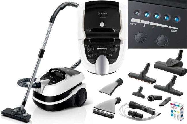 | Thomas Aqua Pet & Famille | La puissance est de 325 W, nettoie avec des méthodes sèches et humides, élimine les liquides de la surface, lave l'air, il y a un sac à poussière, un filtre aqua. |