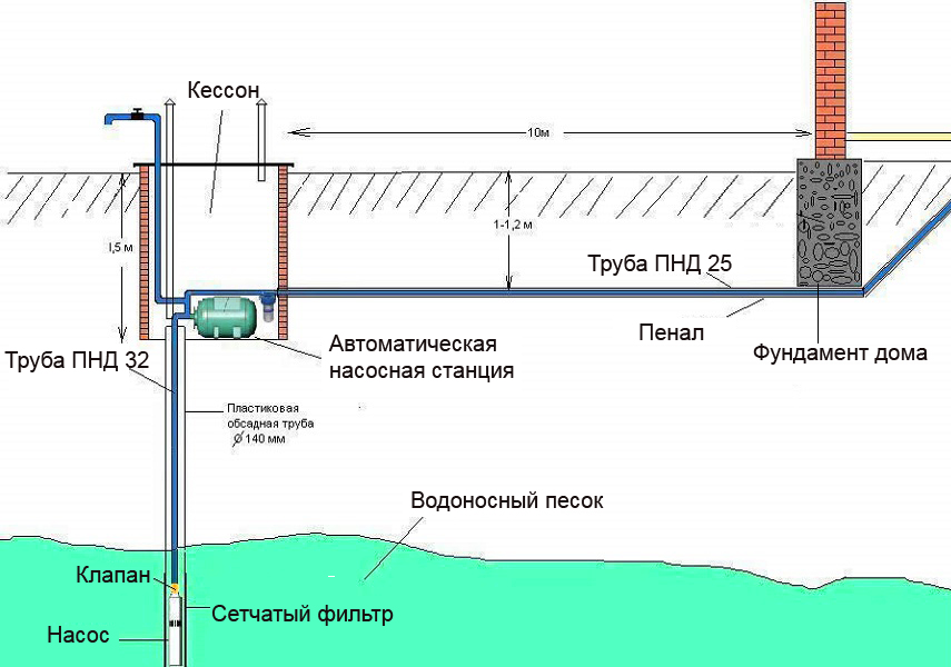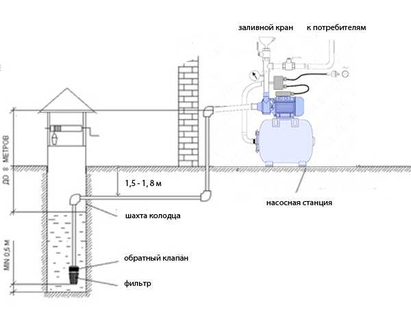 La vanne d'entrée doit être immergée dans l'eau pendant au moins 0,4-0,5 m, en partant du niveau d'eau le plus bas jusqu'aux entrées de la grille. Si l'eau est prélevée à partir d'une source ouverte de faible profondeur, un puits de réception d'une profondeur suffisante doit être aménagé. Dans ce cas, il faut tenir compte du fait que le puits récepteur sera soumis aux dérives du sol. Par conséquent, la profondeur du puits d'admission doit être supérieure de 0,5 à 1 m à la profondeur d'immersion de la partie inférieure de la soupape d'admission de la pompe.