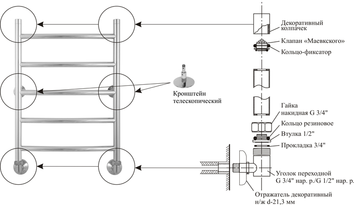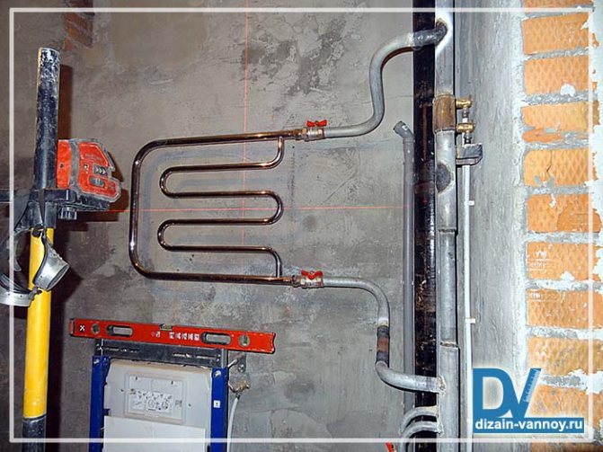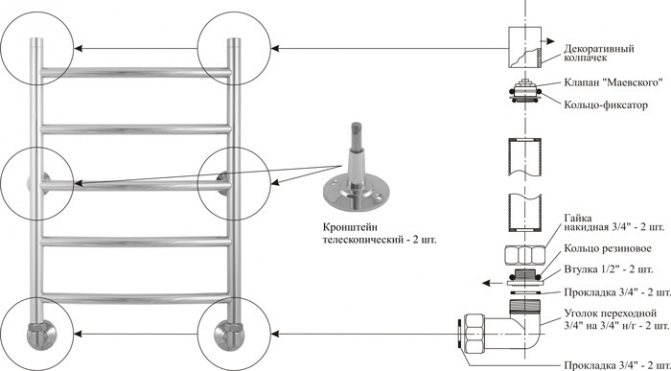 Le montage d'un sèche-serviettes au-dessus du point de raccordement dans la conduite principale augmente le risque de poches d'air - dans ce cas, vous devrez installer un évent (robinet Maevsky)