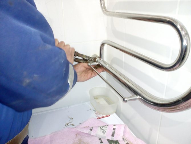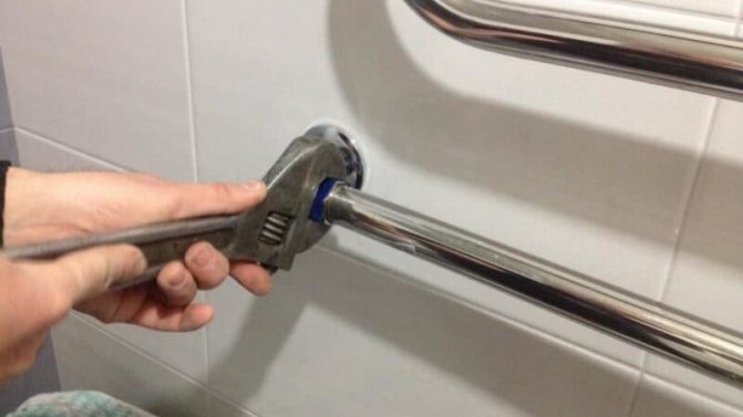 Remplacer l'élément chauffant d'un porte-serviettes chauffant est facile. Si le type d'appareil est inconnu, avant de le démonter, retournez la bobine afin que le fluide de travail ne s'échappe pas. Puis, à l'aide d'une clé à molette, dévisser l'écrou sur sa collerette, démonter et remettre le réchauffeur. N'oubliez pas de vérifier s'il y a un courant de fuite sur le corps du radiateur de conception.Pour ce faire, une sonde multimètre est connectée à la surface métallique du sèche-serviettes et l'autre est touchée à son tour avec les fils de l'élément chauffant - l'appareil doit présenter une résistance infiniment élevée.