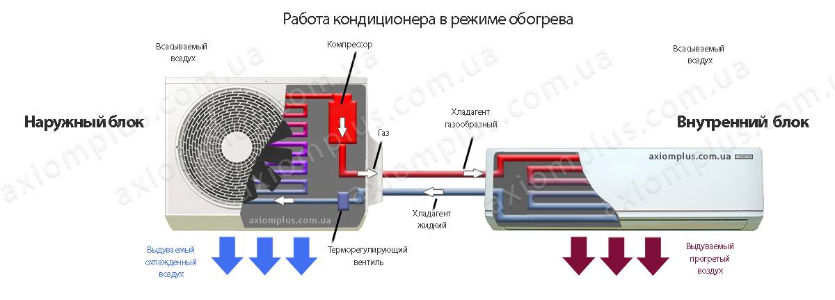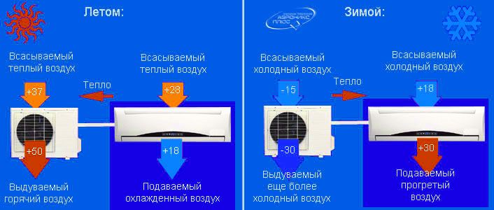 Voyons maintenant ce qui se passe si vous allumez le climatiseur pour le chauffage. Les bobines changent de fonction. Situé sur la rue enlèvera la chaleur, l'intérieur sera chaud. Température plus basse à l'extérieur de la fenêtre, moins de sens est produit par le fonctionnement du système