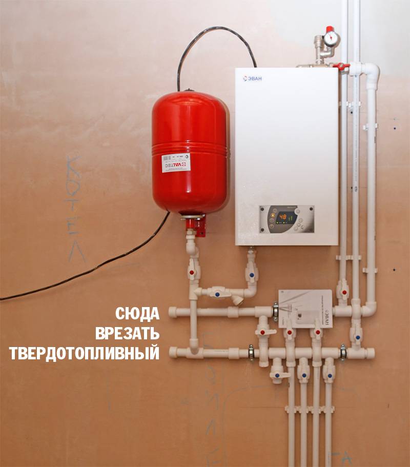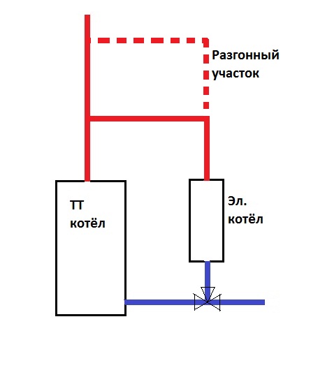 Si vous vivez dans une maison avec un tel système de connexion de deux chaudières de chauffage, une connexion manuelle vous convient parfaitement. La chaudière électrique fonctionnera en cas d'urgence en cas de panne des chaudières pour une raison quelconque. Non seulement arrêté, mais cassé et nécessitant des réparations. Il est également possible de s'allumer automatiquement en fonction de l'heure. La chaudière électrique peut fonctionner en binôme avec du gaz liquéfié et une chaudière solaire au rythme de la nuit. En raison du fait que le tarif de nuit est moins cher pour 1 kW / heure que pour 1 litre de carburant diesel.