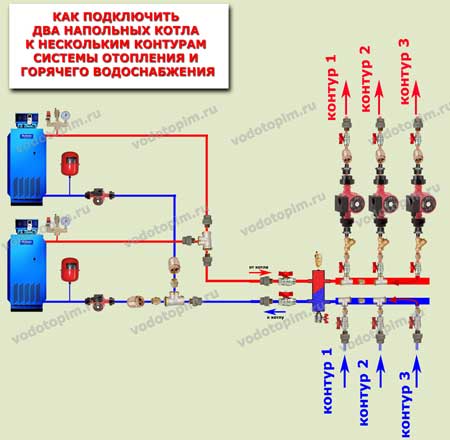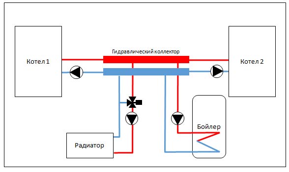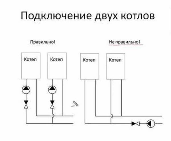 Souvent, le volume de liquide de refroidissement nécessaire pour eux varie, la vitesse de déplacement de l'eau chauffée et sa pression diffèrent. Et dans la situation considérée, le mouvement de l'eau chauffée de chacune des chaudières stimule également sa propre pompe de circulation.