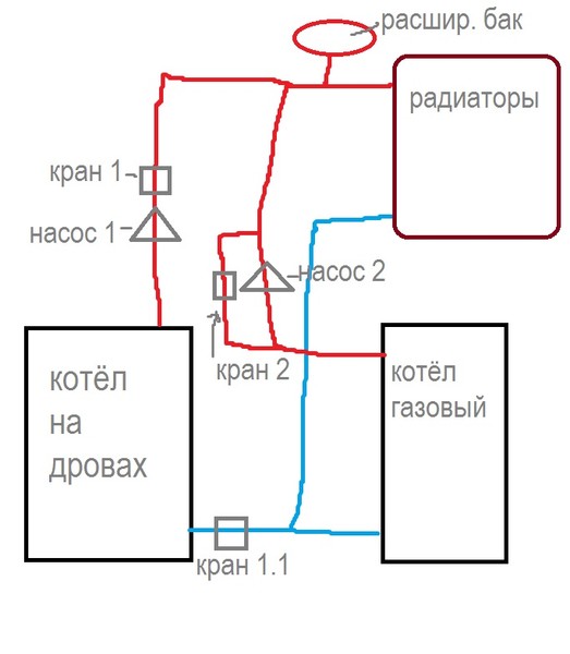 Eh bien, et une autre option, où deux chaudières dans un système fonctionnent à l'eau chaude. Dans un tel schéma, il est tout à fait correct de faire en sorte qu'une chaudière chauffe de l'eau pour un groupe de consommateurs, par exemple pour une douche; le second est pour tout le monde: