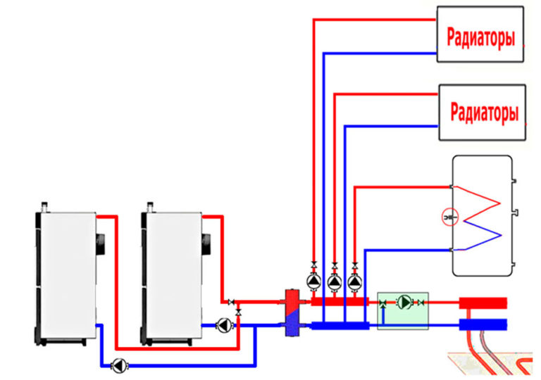 Veuillez noter: dans la tuyauterie des chaudières, par rapport au premier schéma, un ajout est apparu - des clapets anti-retour pour chaque chaudière. Aussi : à la place des radiateurs, vous pouvez brancher des branches d'un plancher chauffant à l'eau sur les sorties des collecteurs, comme ici, ou une chaudière à chauffage indirect, et tout fonctionnera