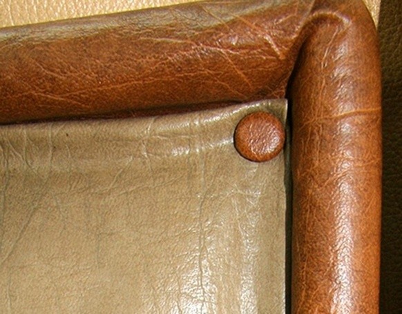- Au-dessus du caoutchouc mousse est recouvert de cuir artificiel. Les rouleaux sont formés à partir des bords suspendus et fixés avec des clous pour meubles. Le plan général de la toile est décoré d'un motif. Il s'avère après le clouage. La mousse souple entre les chapeaux larges forme de beaux renflements. Entre les attaches, vous pouvez tendre du fil ou des bandes de dermantine cousues avec un tube.