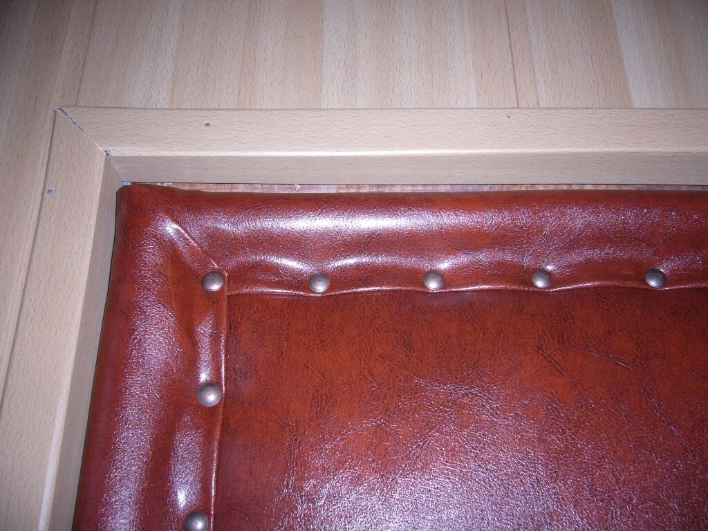 La mousse est coupée à la taille intérieure du cadre et collée à la porte. Une feuille de PEHD est posée sur le cadre et clouée avec des clous pour meubles. Les extrémités visibles du cadre sont peintes dans une couleur appropriée.